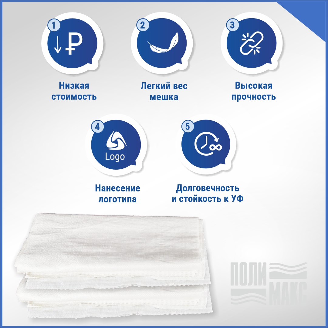Компания «Полимакс» предлагает белые мешки из первичного полипропилена размером 56×107 см и вместимостью до 50 кг. Плотное плетение обеспечит сохранность содержимого. Ткань воздухопроницаема, поэтому пищевая продукция сохраняет свое качество. Посторонний запах отсутствует.