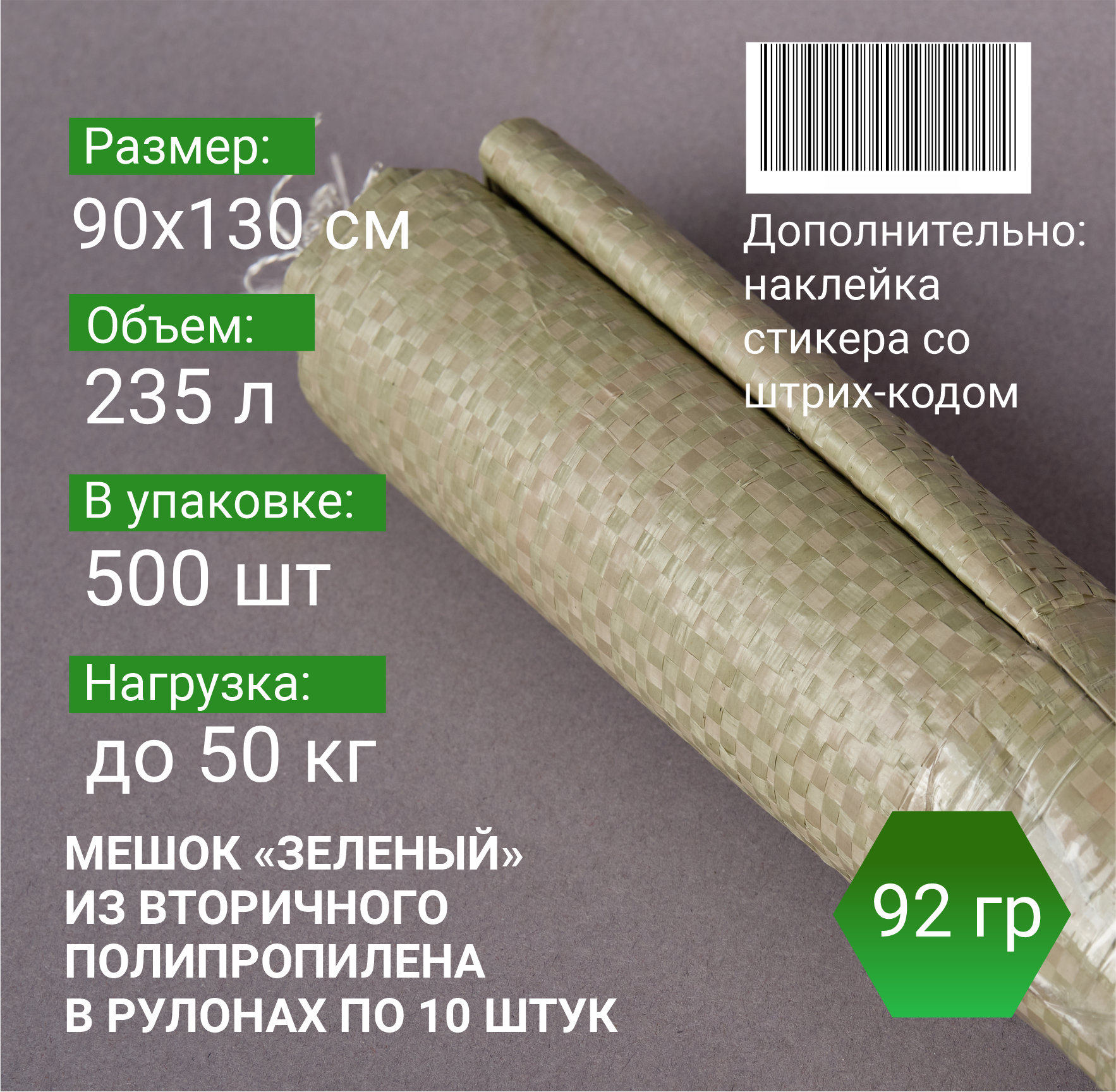 —Мешок п/п зеленый 50 кг, 90x130, 92г, рулоны по 10 шт.